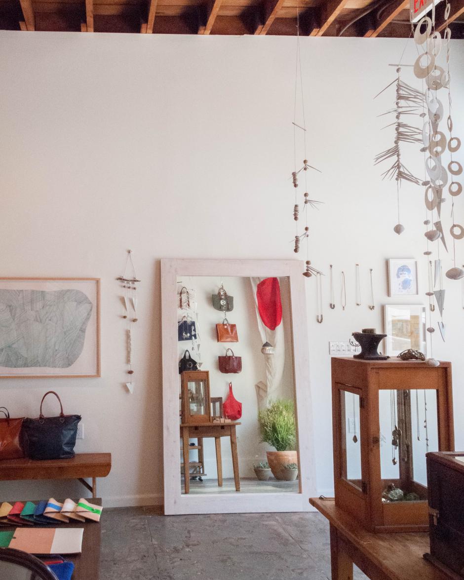 Occupying the front part of a shared studio centered around a handpainted 'rug', the boutique showcases Claire Vivier's elegant leather handbags and Kathryn Bentley's roughly refined Dream Collective high-end costume jewelry along with artwork and mobiles from friends and neighbors. Creativity oozes from the backroom, making the space feel like a community art project gone terribly and extraordinarily right.